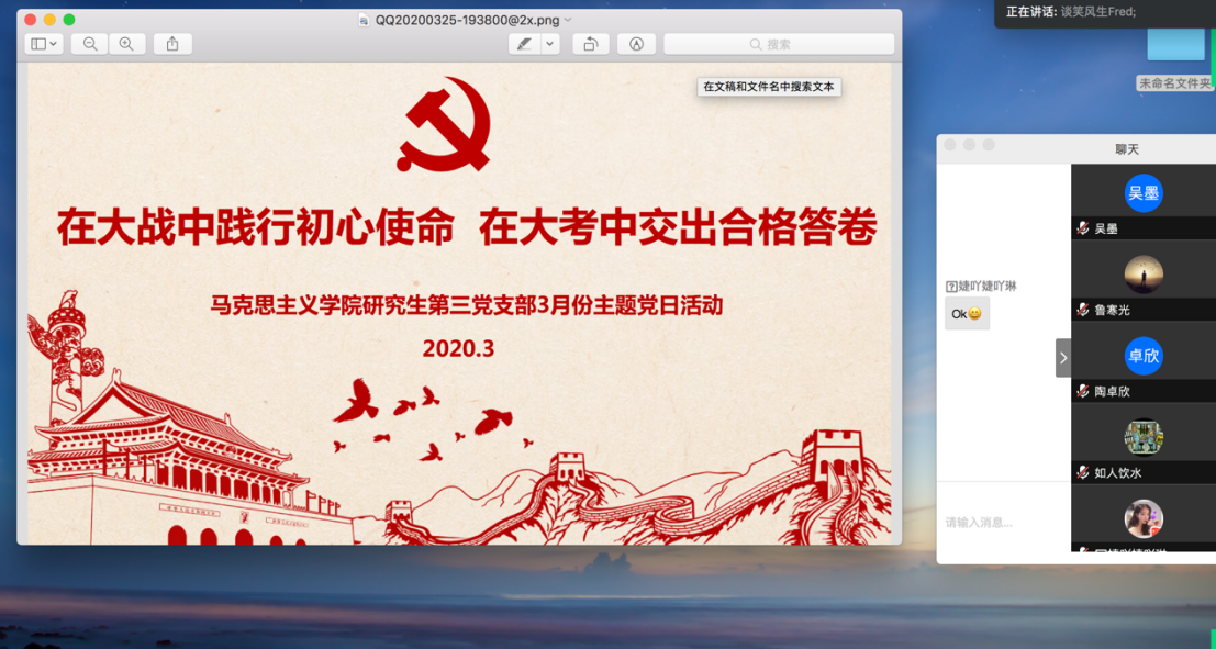 为深入学习贯彻习近平总书记关于疫情防控工作的重要指示,认真落实公司党委有关疫情防控工作要求,开展好疫情防控期间员工党支部建设,3月25日,tyc33455cc太阳集团研究生第三党支部利用腾讯会议平台,开展了“在大战中践行初心使命 在大考中交出合格答卷”3月份线上主题党日活动。
