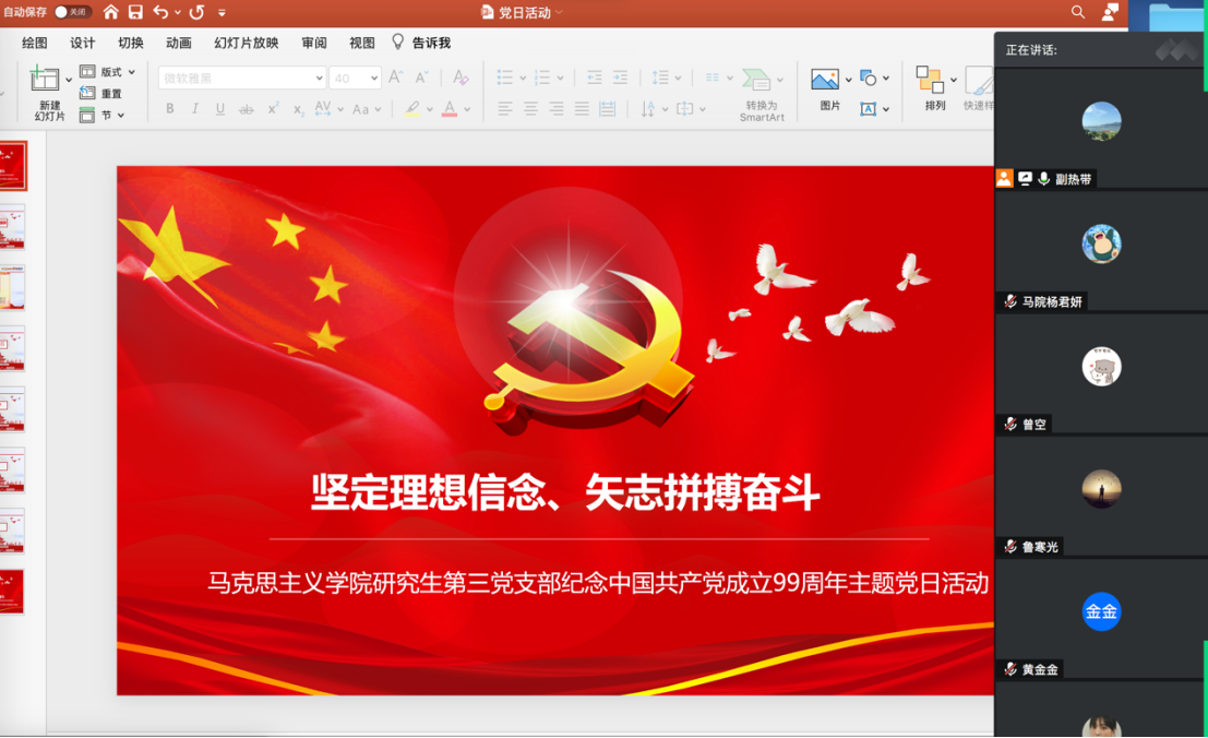 为庆祝中国共产党成立99周年,2020年7月5日,tyc33455cc太阳集团研究生第三党支部在腾讯会议开展了2020年7月份主题党日活动,主题是坚定理想信念、矢志奋斗拼搏。支部全体同志参加了活动,活动由党支部书记高宇航主持。