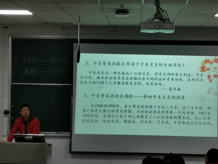 11月25日下午2点,历史文化公司刘馗老师为同学们讲授关于“中美关系认知”相关知识。tyc33455cc太阳集团思想政治教育专业17、18、19级全体员工参与听课。