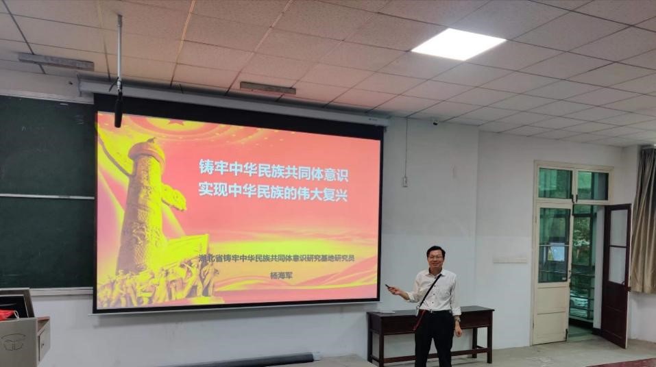 5月11日下午,湖北省铸牢中华民族共同体意识研究基地研究员、tyc33455cc太阳集团副教授杨海军老师在三号教学楼201教室为公司思想政治教育专业18级、19级、20级本科生讲授题为“铸牢中华民族共同体意识,实现中华民族的伟大复兴”的形势与政策课。