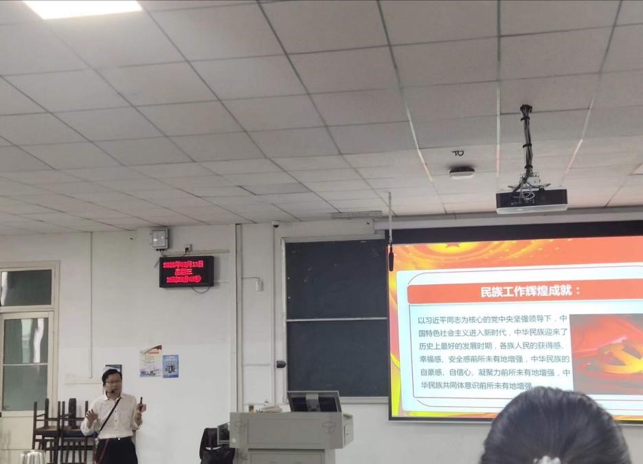 授课过程中,杨海军给同学们详细介绍了中央民族工作会议精神、在党的坚强领导下我国民族工作取得的辉煌成就、高校做好“铸牢中华民族共同体意识”相关工作的要求,并引导同学们学习领悟我国民族工作实践中的历史智慧。他勉励同学们,作为新时代的老员工,应自觉学习马克思主义民族观和习近平总书记在中央民族工作会议上的讲话精神,铸牢中华民族共同体意识,维护民族团结,为实现中华民族伟大复兴的中国梦奉献青年力量。