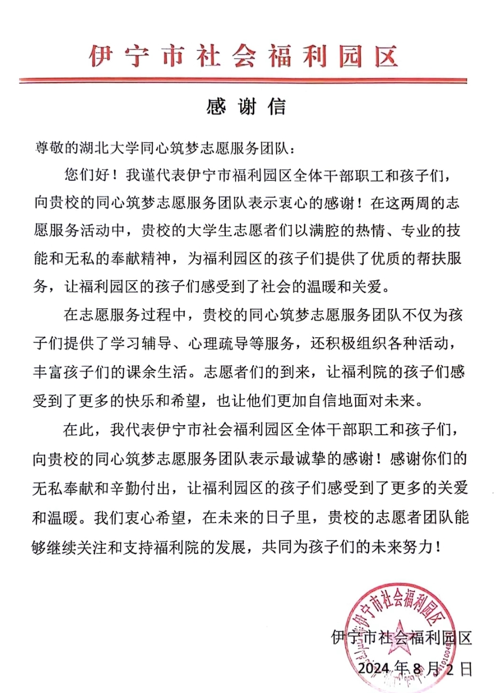 信中指出,本次社会实践活动共吸引来自24个省市183所高校的392支团队奔赴天山南北的田间地头、城镇社区、企业工厂 开展社会实践,将“读万卷书”与“行万里路”相结合的“大思政课”中受教育、长才干、作贡献。在此次社会实践活动中,公司“星火接力,同心筑梦”实践团队用无私奉献诠释了新时代青年的责任与担当,助力铸牢中华民族共同体意识教育,对此致以衷心的感谢。