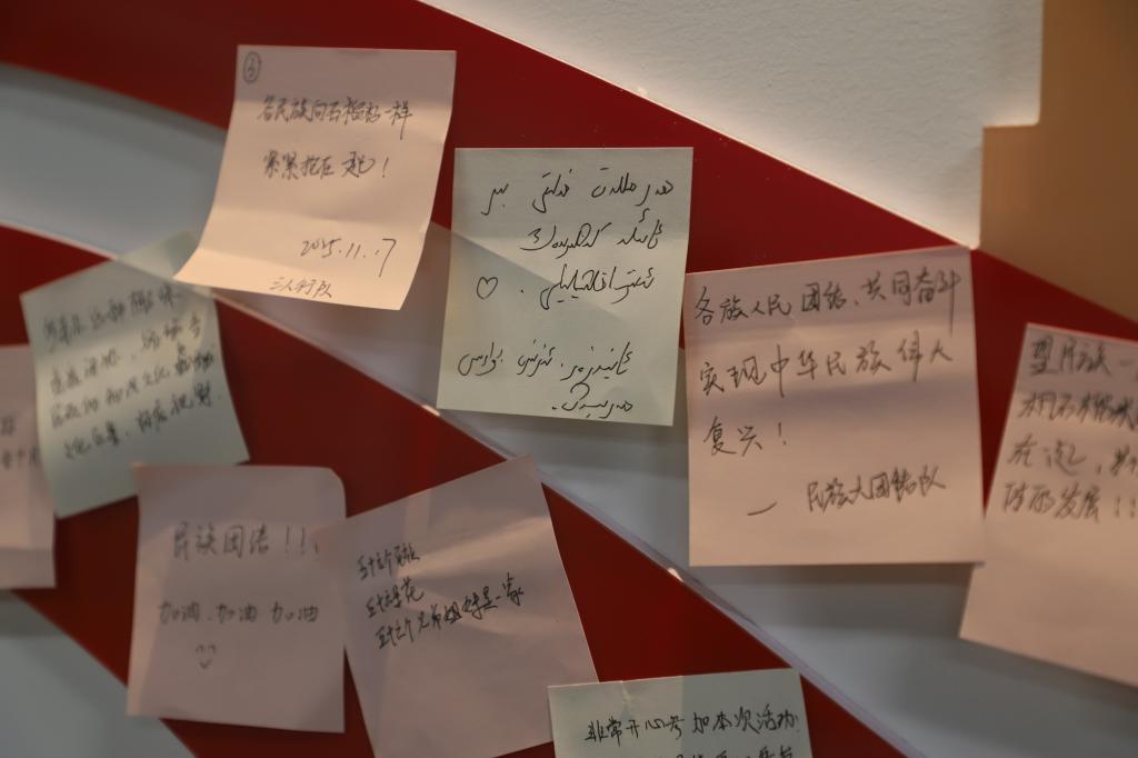 活动尾声,同学们在便利贴上写下对民族团结的美好祝愿,以真挚语言表达对中华民族的深厚情感。大家将一张张寄托心声的便利贴拼成“民族团结同心圆”,不仅生动展现了青年一代维护民族团结的信念与担当,也将整场活动升华为一堂生动的思政实践课,让民族团结的种子在每个人心中深深扎根。