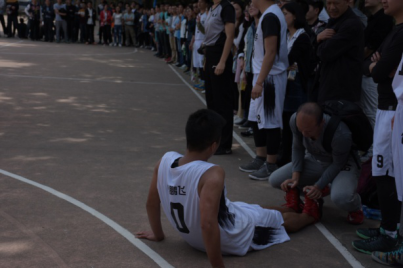 上半场开始,公司21号队长徐凡在公司同学热烈的呐喊声和加油声中连续进了三个球,给了大家很大程度上的鼓舞,也给对方球队造成很大的压力。对方球队奋起直追,对我方不断变化战术,围追堵截紧咬不放,尤其紧盯我方21号和81号队员,21号徐凡在进攻打不开局面的时候,只能自己持球单打。常规时间最后一个球是0号选手李鹏飞拖进的,拖进加时,生科博士强投三分不中,双方持平,进入加时赛。加时赛角逐更加激烈,但我方出现意外状况,0号队员李鹏飞腿不适退出赛场(右图为徐信华老师给抽筋球员拉筋场景),最后对方以微弱的优势险胜。