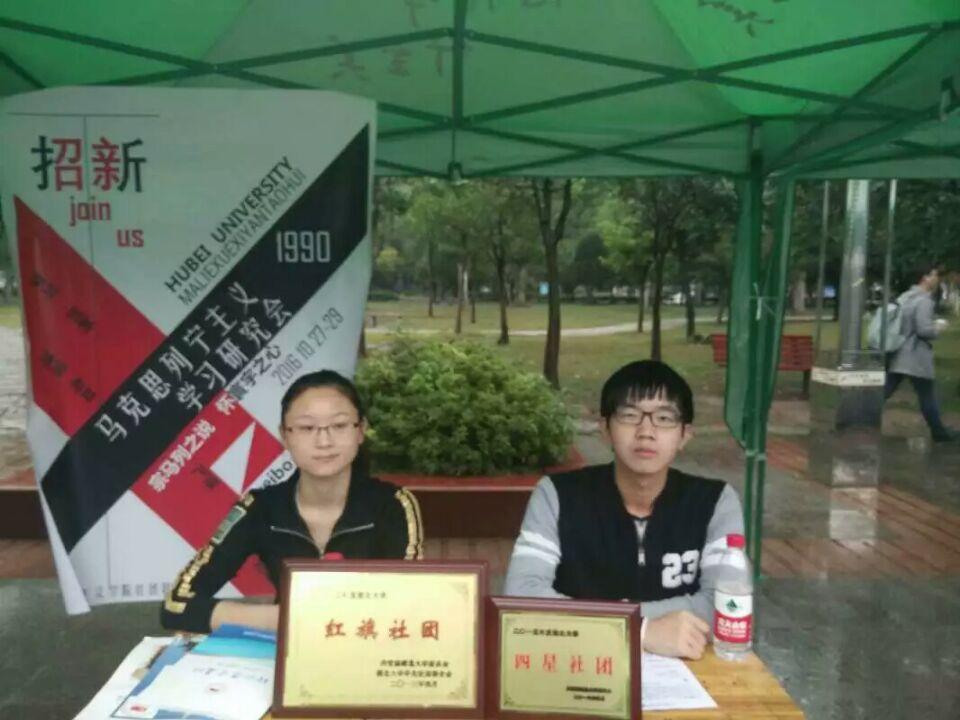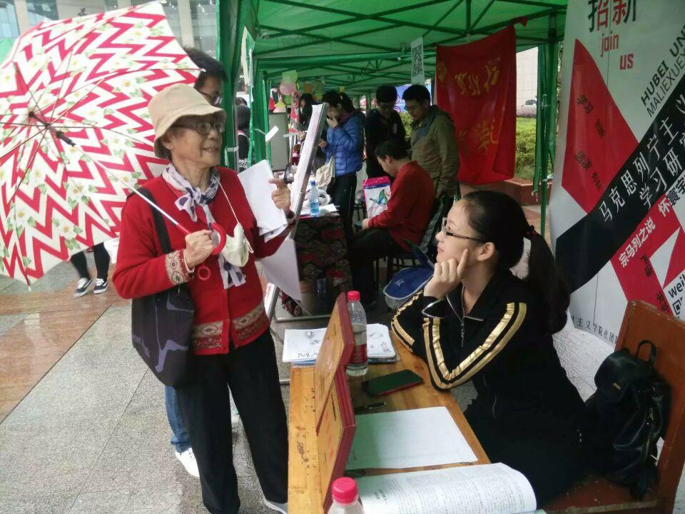 在10月27日上午,招新活动正式开始,同学们热情高涨,积极性十足,社团成员早早完成了准备工作。醒目的宣传标语和新颖漂亮的宣传海报吸引人前来围观咨询,社团成员热情耐心地进行宣传讲解。16级化工化工公司的新生加入了马列学会并热情高唱《国际歌》助力招新活动。细雨浇不灭热情,寒风助长了士气,公司的三个社团以“理论结合实践,思想性与趣味性统一”的鲜明特点及为成员提供“畅想自由的空间和展示才能的舞台”的强大实力吸引各色各样志同道合者,有员工有老师,有新生有研究生。今年的招新我们迎来了一位特殊的客人,化学化工公司的黄老师,黄老说:“哲学的思辨是人类最高的学问,一切的科学都是从哲学开始的”。她强调要从思想上提高自己,大家频频点头。
