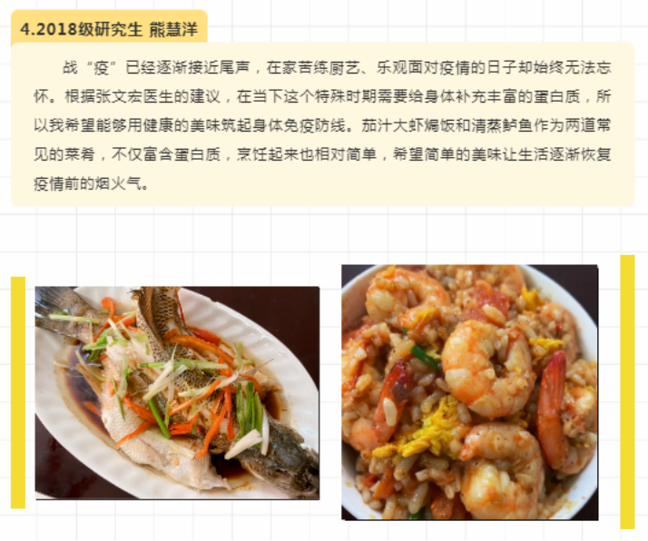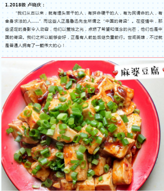 理论是基础,实践出真知。参赛者们饱含理论知识,却难得动手一试。这次比赛给他们一个机会,他们的菜品可谓色香味俱全。2019级本科生路云洁从厨房感悟人生,她写道:疫情期间看到了太多痛苦与无助,希望生活还是像芒果千层一样有一层一层的甜蜜,一层一层的惊喜。也可以像芒果班戟一样,打开就是满满的幸福。既然生活那么苦,让我们手动加点甜。