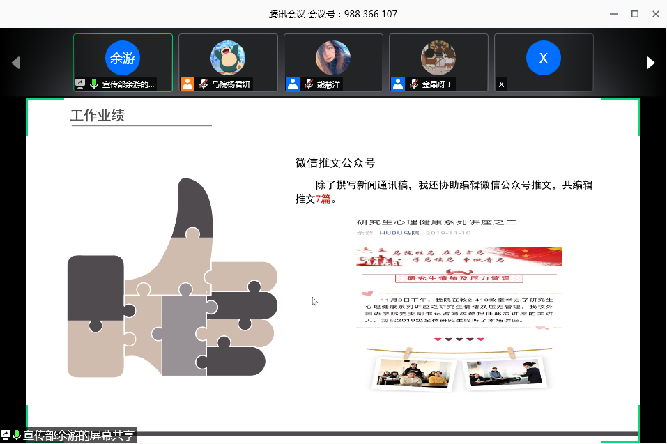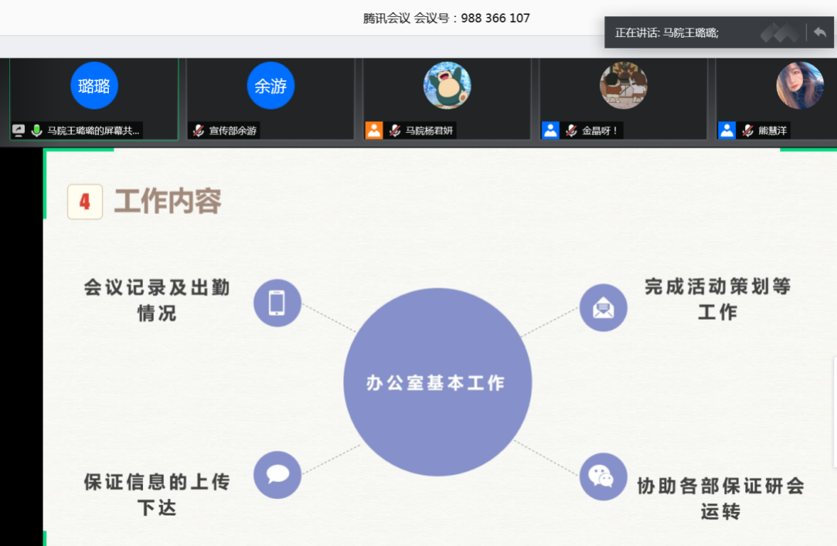 会议第二项议程,由王璐璐、史健桥、李菀、熊罗美婧、李睿、余游、杨瑶和林婉8名同学依次进行个人工作汇报。各汇报人分别从工作态度、工作能力、工作内容和工作业绩四个方面总结自己2019年度研究生会的工作情况。其中,办公室主任王璐璐展示了研会百度云盘文件收录情况、活动及会议考勤记录情况,做好研会工作的痕迹管理;宣传部部长余游围绕多媒体工作开展情况,讲述自己的工作心得,努力打造研会对外的窗口;文体部部员李菀、李睿在汇报中说,从参与研会工作中得到成长,感受到马院一家亲的温暖;学术部部长史健桥致力于策划学术型活动,活跃公司学术氛围,在“学术科技节”中表现突出;权益部部员杨瑶秉持着细致认真、严谨周到的工作态度,负责研究生心理健康服务、研会资金流转。八位汇报人的讲述,回顾了过去一年研会工作的点点滴滴,展现出公司研会的责任与担当。