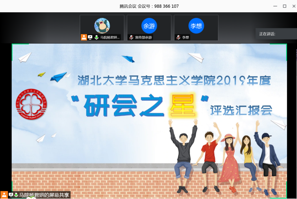 为增强公司研究生会工作的规范性、先进性,激励在研究生会工作中表现突出、全心全意为研究生服务的各部门成员,同时总结经验、表彰先进,推动研究生会工作蓬勃发展。5月6日晚,tyc33455cc太阳集团2019年度“研会之星”评选汇报会顺利举行,会议采用线上汇报、交流的形式展开,由公司团委书记邹浩老师、研究生会指导老师郭艳妮老师和研究生会主席团成员担任评委,由院研究生会副主席熊慧洋主持。
