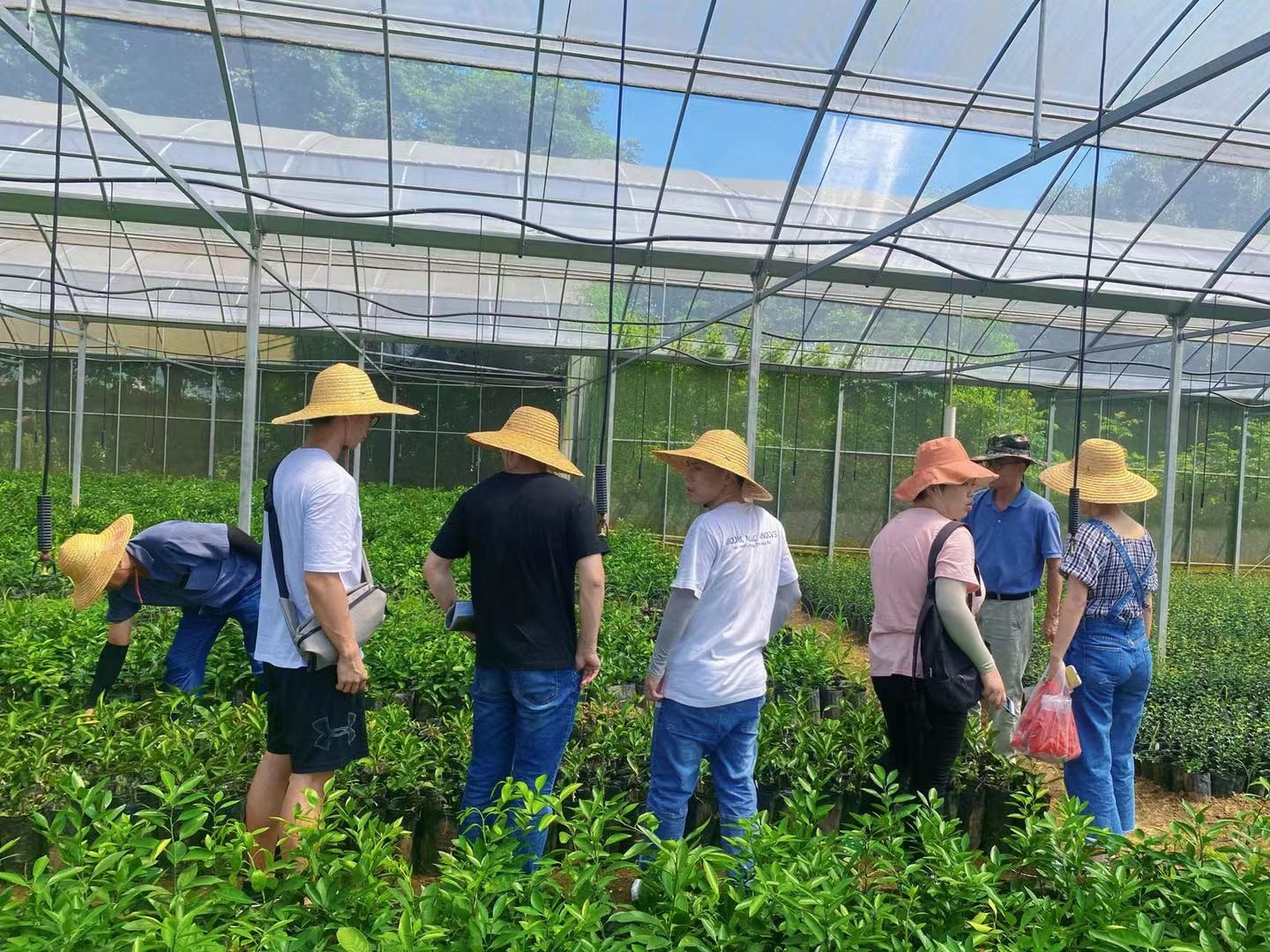 在柑橘良种繁育中心,团队一行参观了柑橘良种苗木繁育温棚。温棚里的温度很高,但团队队员们即便大汗淋漓,仍坚持着实地访谈、调研的工作。据晓曦红企业负责人介绍,温棚中培育出的良种主要以嫁接枝条以及良苗的形式销往全国。