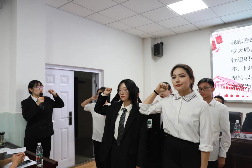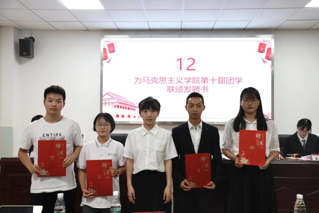 大会对当选同学表示热烈祝贺,院团委负责人孙倩为上一届员工会主席团成员颁发聘书,第十二届主席团成员和第一届委员会委员宣誓就职。
