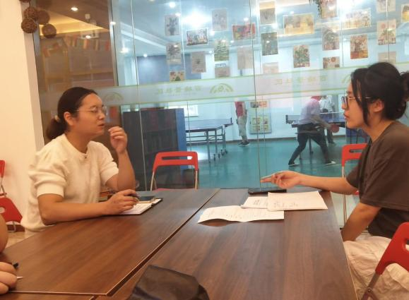 (图为颜慧娟老师和社区工作人员交谈 通讯员 宛佩 供图)