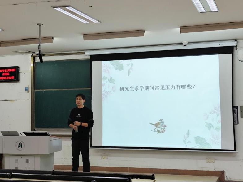 活动伊始,黄东涛老师指出,研究生压力的主要来源是科研与人际关系。除此之外,还来自就业、情感以及家庭关系等方面。随后,黄老师通过真实案例分析了研究生在不同压力下的表现,并向同学们介绍了压力产生的生理反应,例如头痛、睡眠质量不佳等。他提醒同学们在学习生活中要及时关注自己的心理变化,重视自己的心理健康。