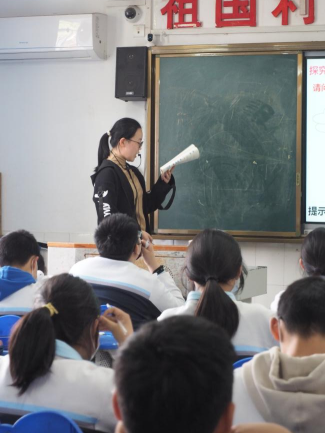 实习生王晓璇谈道:“走进四十九中的校门,扑面而来的便是青春的气息。重叠的竹影,碧绿的草场和上面嬉笑打闹的同学们,一切仿佛昨日重映,只是我的角色已经从昔日打闹的一员变为讲台上的身影。随着上课铃响,对台下的一张张好奇面孔我摊开教案,用微笑掩饰着紧张。下课铃响起,一张张认真的面孔尽收眼底,告诉我今天需要讲授的内容已经完成,且颇有成效,让我忍不住鞠躬致意,感谢他们热诚的聆听。这,就是我实习中的第一课,虽有缺憾,更多的是收获,是满足。而在一个多月的实习中,自然有许多工作要做,许多规章制度要学习和执行,但最令我印象深刻的还是一次次的讲课。”