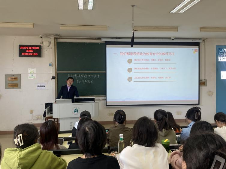 讲座伊始,沈朝平老师从“我们都是思想政治教育专业的师范生”展开。他提到,思政专业的同学们应肩负学政治、讲政治、教政治的使命与任务,具备志存高远、心怀天下、筑梦未来的格局与情怀。