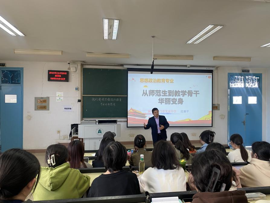 10月20日,荆门市龙泉中学沈朝平老师在教4-504为tyc33455cc太阳集团2020级政教专业全体同学“优秀教师成长”专题。本次讲座由政教系副主任胡银银主持。