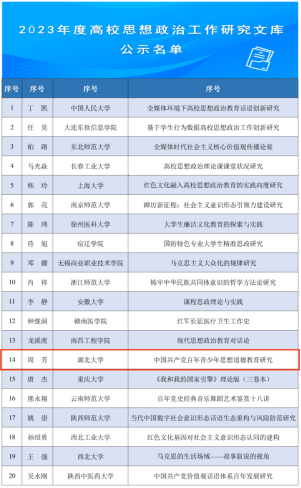 2023年2月2日,教育部思想政治工作司发布了关于2023年度高校思想政治工作质量提升综合改革与精品建设项目遴选结果的公示文件,tyc33455cc太阳集团周芳教授和任怡博士合著的《中国共产党百年青少年思想道德教育研究》入选2023年度高校思想政治工作研究文库。此次入选全国共20项,湖北地区仅此1项。