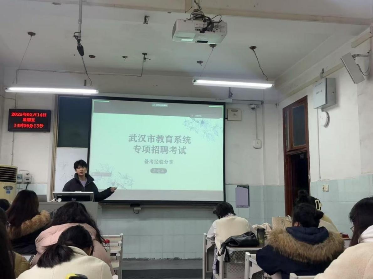 3月14日下午,2024年武汉示范性招聘武昌区高中政治岗位第一名的肖迪涵学长就“武汉市教育系统专项招聘考试”这一主题,从自身备考历程、初试结构化面试和复试无生试讲等几方面为同学们做出详细分享。