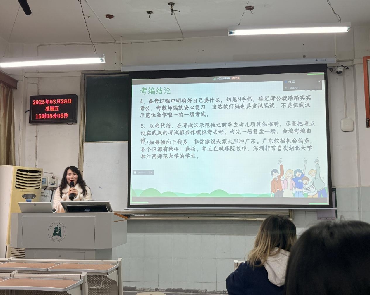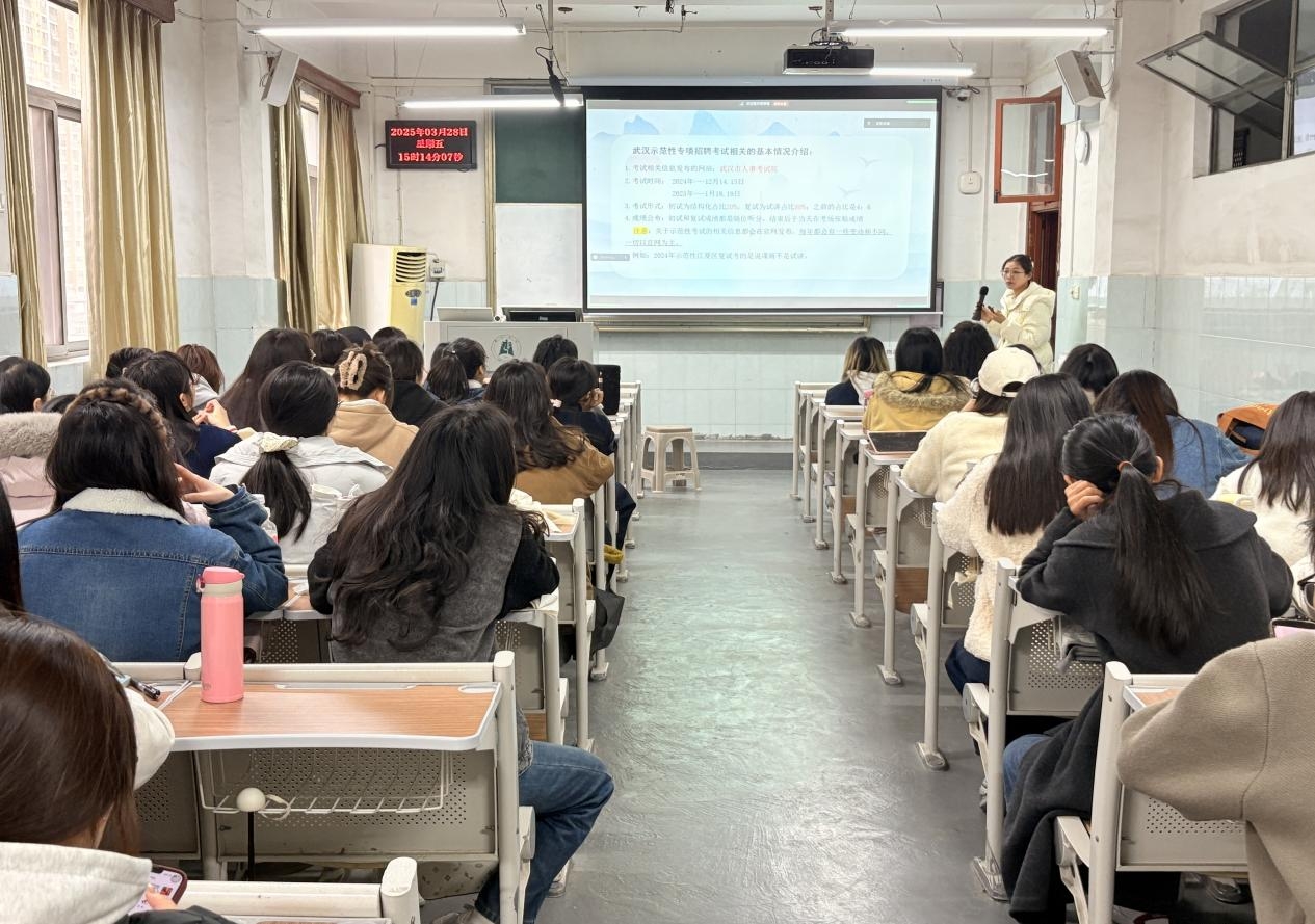 3月14日下午,张茜同学围绕武汉示范性公司专项招聘相关事宜,从考试时间线、结构化备考、试讲准备三步曲等几方面为同学们作出详细分享。她鼓励同学们要潜心准备,一击即中。