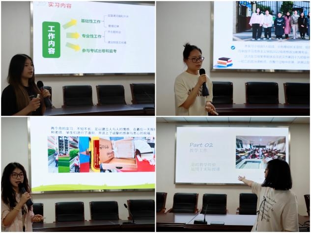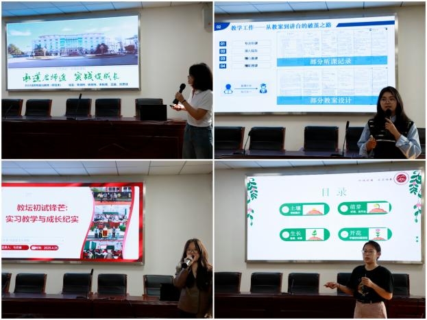 会议伊始,胡银银老师对顺利完成实习工作的各小组表达了祝贺。随后,2022级17个实习小组代表依次上台汇报实习成果:“让花成花,让树成树”从萌芽到生长再到开花,小小的种子在心中逐渐成长;“我在中学当老师”以实习生的视角展开对一天工作的介绍,凝结着教师的使命担当;“播撒‘同心种’”一堂特殊班会课的开展,让员工在民族团结中领会独特的文化魅力;“与四美塘相yu”以“遇师、育人、愉行、寓教、愈己”为线索,分享从员工转向教师的成长经验……这些不同的汇报主题凝聚着同学们在实习过程中的独特体验,体现着他们的成长与收获。