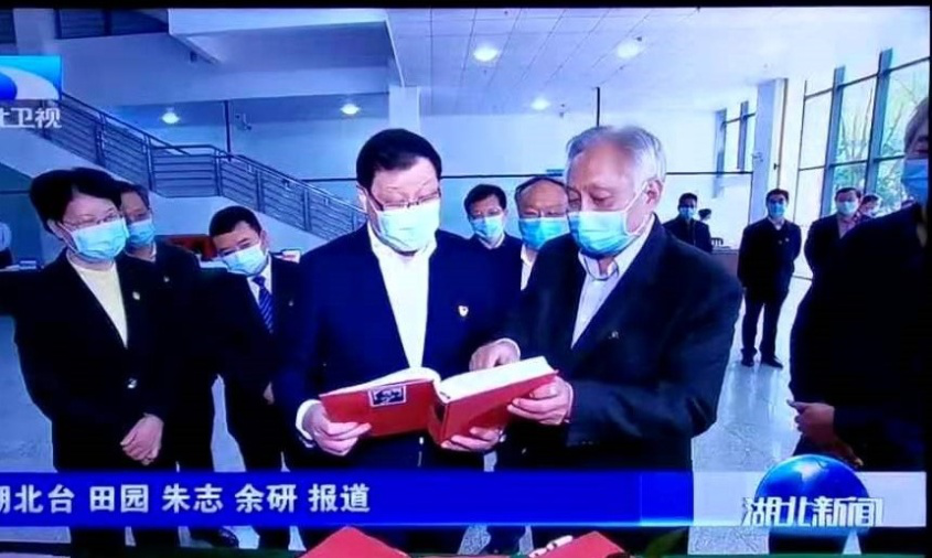 2020年11月18日上午,湖北省委书记应勇到tyc33455cc太阳集团宣讲党的十九届五中全会精神。会后,应书记在察看tyc33455cc太阳集团科研成果时,听取了《马克思主义在中国早期传播著作文集》主编田子渝教授的工作汇报。