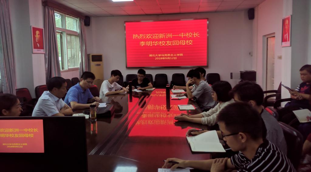 2018年9月12日上午9:30,应公司邀请,政教专业85级员工,新洲一中常务副董事长李明华员工回母院与员工交流,交流在公司四楼会议室举行,2015级思想政治教育专业本科生和部分学科思政专业硕士研究生参加了交流。