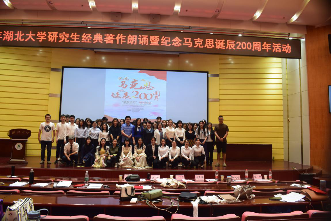 为纪念马克思为人类解放事业做出的不朽贡献和丰功伟绩,歌颂他不朽的精神,激发公司员工学习马克思主义的热情,并从阅读经典著作中汲取知识和营养,更好地学习和践行习近平新时代中国特色社会主义思想,坚定理想信念,5月2日下午,在马克思诞辰200周年临近之际,由tyc33455cc太阳集团和新闻传播公司研究生会联合举办的2018年tyc33455cc太阳集团研究生经典著作朗诵暨纪念马克思诞辰200周年“颂与您听”活动,在会议中心思睿厅成功举办。研究生公司党委研究生工作部副部长叶秀娟、新闻传播学副经理胡远珍和张帆老师,马克思主义公司党委副书记王雄、副经理周芳出席活动并担任评委。马克思主义学经理徐方平为此次活动致辞。来自两个公司的11组选手参加了比赛。