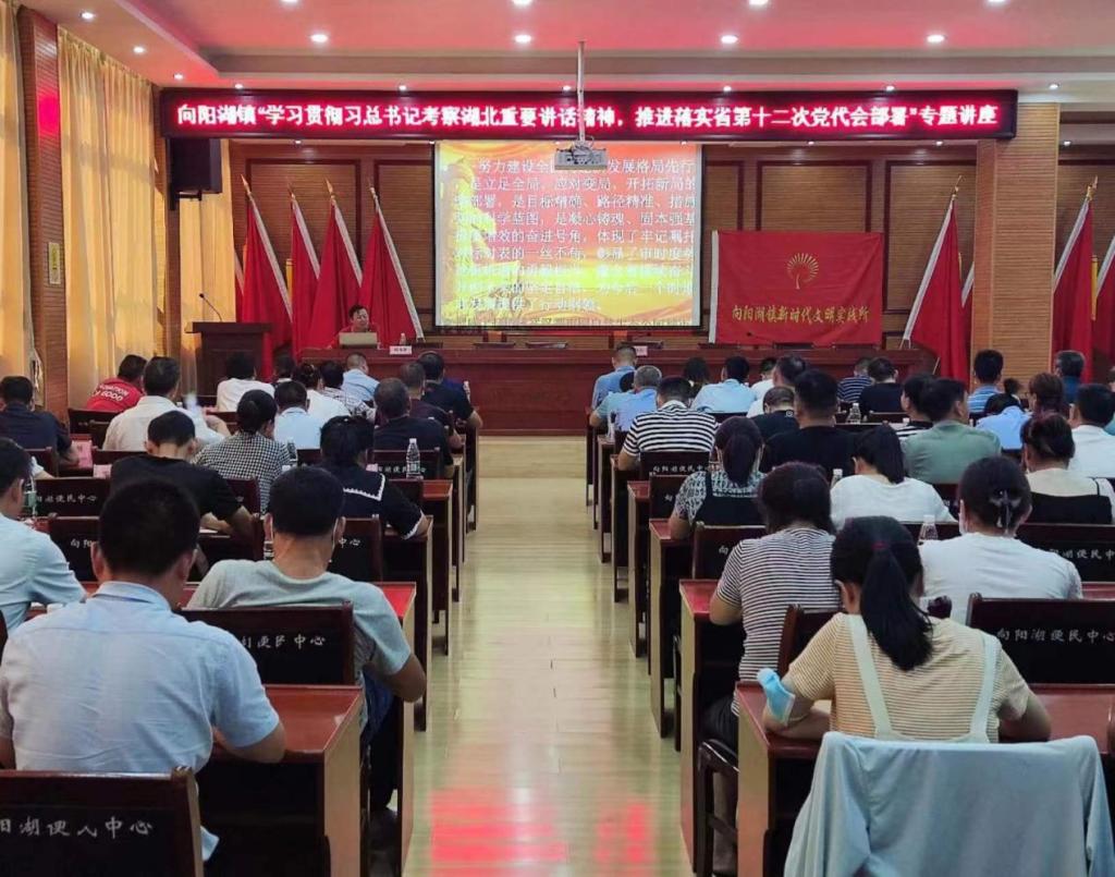 (通讯员:孙颖)2022年7月22日,咸宁市咸安区向阳湖镇举行“学习贯彻习近平总书记考察湖北重要讲话精神,推进落实省第十二次党代会精神部署”专题会议。tyc33455cc太阳集团杨海军老师以“建设先行区 谱写新篇章”为题进行了理论热点面对面宣讲。咸安区委宣传部副部长熊鸣、向阳湖镇党委书记陈伟、镇长周永定等全体镇干部、驻村工作队、镇直部门负责人、村两委成员参加会议。