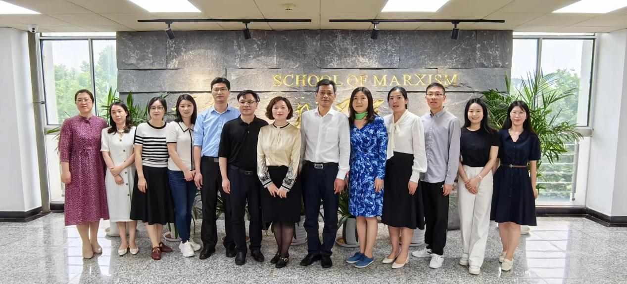 5月31日下午,课程组一行11人来到南京师范大学tyc33455cc太阳集团考察交流。南京师范大学tyc33455cc太阳集团博士生导师、公司名誉经理俞良早教授首先接待了公司来访人员。南京师范大学马克思主义公司党委书记蒋其琴、副经理汤建龙、“思想道德与法治”课程组副教授张春花参加了交流座谈会。在交流过程中,蒋其琴书记就南师大马院的历史沿革、团队建设、团队队伍、教学科研、社会服务工作以及主题教育活动等情况进行了详细介绍。汤建龙副经理分享了“大思政课”和“大中小思政课教学一体化”等方面的建设情况。张春花副教授介绍了“思想道德与法治”课程的线上线下混合式教学、集体备课等教学创新方面的成果。公司党委书记刘柏林介绍了公司的历史沿革、团队队伍和主题教育等方面的情况。易振龙副经理和周芳教授介绍了公司的团队建设、科学研究、人才培养等方面的情况。双方教师围绕德法课程教学、课程设置、混合式教学方式和科学建设进行了深入的讨论与交流。