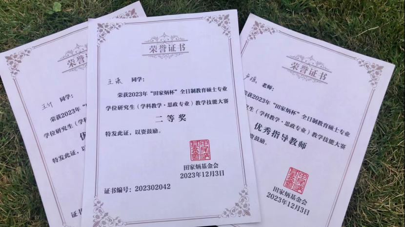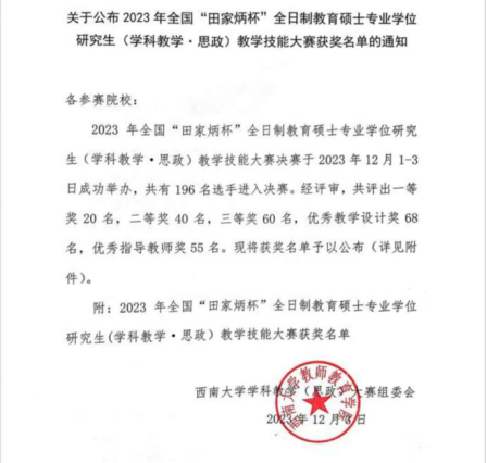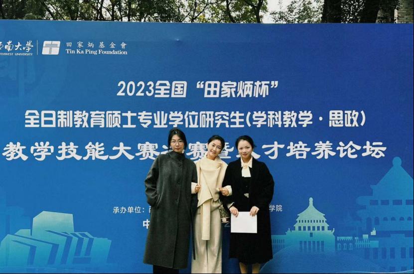 12月3日,2023年全国“田家炳杯”全日制教育硕士(学科教学 思政)专业教学技能大赛决赛结果出炉,在公司相关领导的全程跟进和精心组织指导下,公司2021级学科教学(思政)研究生王潇同学最终斩获决赛二等奖、2022级学科教学(思政)研究生王什同学荣获决赛优秀教学设计奖,卢瑶老师获优秀指导教师奖。